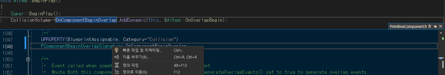 그 다음 FComponentBeginOverlapSignature 에서 우클릭 정의 피킹 또는 ( F12 + Alt)