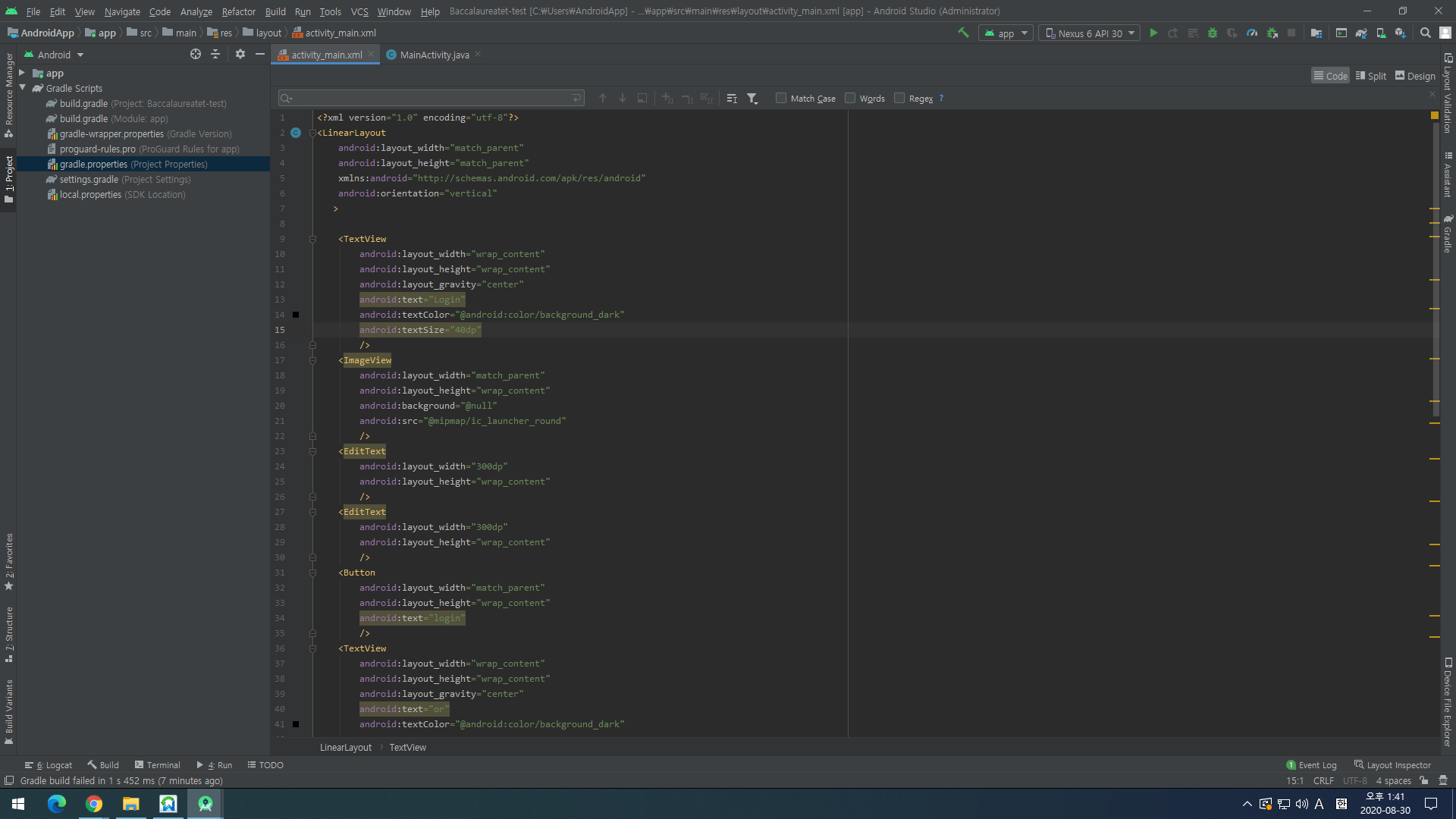 Android Studio(1)-앱 화면 그리기,레이아웃 안드로이드 스튜디오를 통해 앱 화면에 글을 쓰고 원하는 위치에 배치하기 -작성되는 순서가 가로로 될 것인지 세로로 작성할 것인지를 정한다. -작성되는 순서를 미리 정하지 않고 하나하나 위치를 따로 지정한다. 저 둘은 쓰임세에 따라 잘 정해줘야 한다. 은 바로바로 작성 할때는 편리하게 사용할 수 있지다. 은 순서와 상관없이 작성하는 글을 원하는 위치에 위치시킬수 있다. 결과 Android Studio 2020.08.30